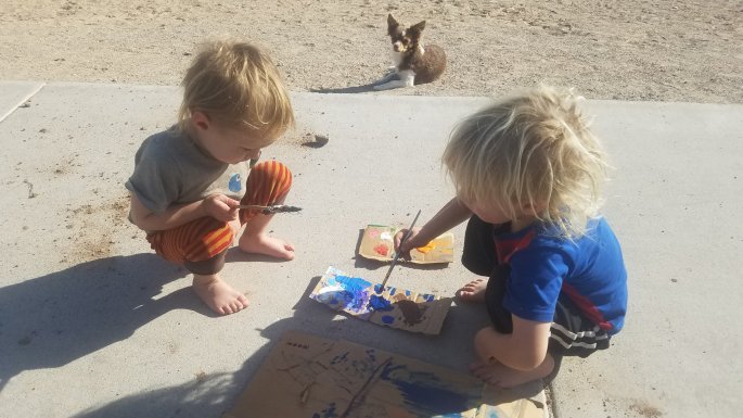 After a while, we decided to head into town. I wanted to go to the grocery store and set up shop, but atreyu interjected to go to the park. Once we arrived, Galixy had fallen asleep. I decided to paint while atreyu played in the dirt. He saw me pull my paints out and immediately requested his own brush. But I couldn’t find any extra, so we fashioned one from palm tree. The hairy fibers made a good brush, tied with some string to a dense piece of palm stick. He was pleased. I finished painting my piece on the bus and handed my brush over to atreyu just in time for Galixy to awaken and ask to paint, too! So it was used twice.