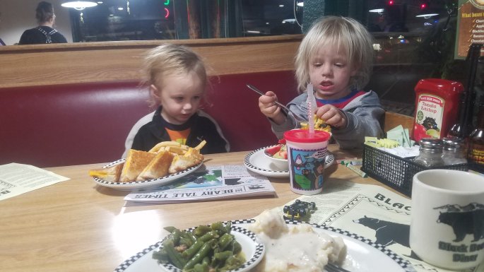 After I collected myself and wasted the rest of the daylight hours, I decided to treat the kids to a “real meal” sit down restaurant style, what with galixy sick, I wanted him to have options to nibble at from whatever he chose. We went to the Black Bear Diner. Galixy drank a full thing of chocolate milk and had some bites of my salad. Atreyu ate mac and cheese and I had a country fried steak. Yum breading and gravy.