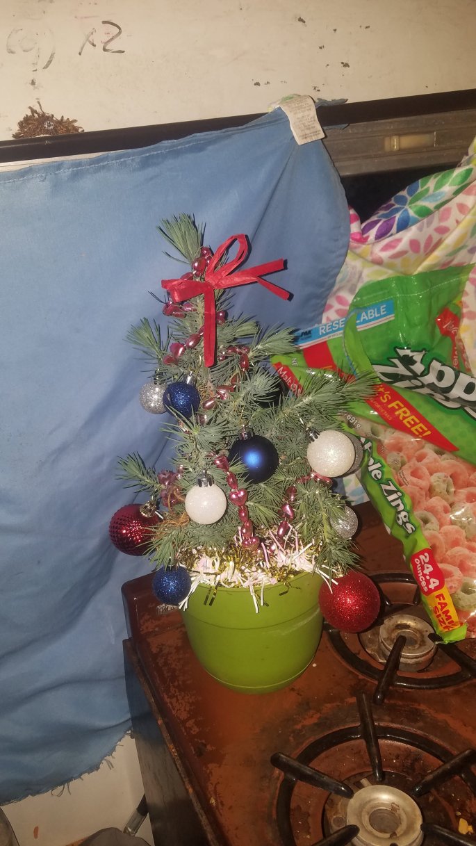 After we went into Albertsons and bought the few things we were running low on like bread, bananas, and pancake mix. We also found a teeny tiny tree for the bus, so Atreyu and I decorated once we got out to our parking spot. It looks lovely in here. Few more things from the dollar store and some battery powered twinkle lights and it’ll be Christmas wonderland in Matilda.