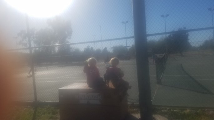 The sun is shining in the bright blue sky. Theres chill in the air from the frigid night. The cat is roaming the playground almost like the dog. The kids are playing happy. They slide down holding hands. Galixy “cooks” the weeds with mud and Atreyu “eats” it. Then they watch the Tennis kids play.
