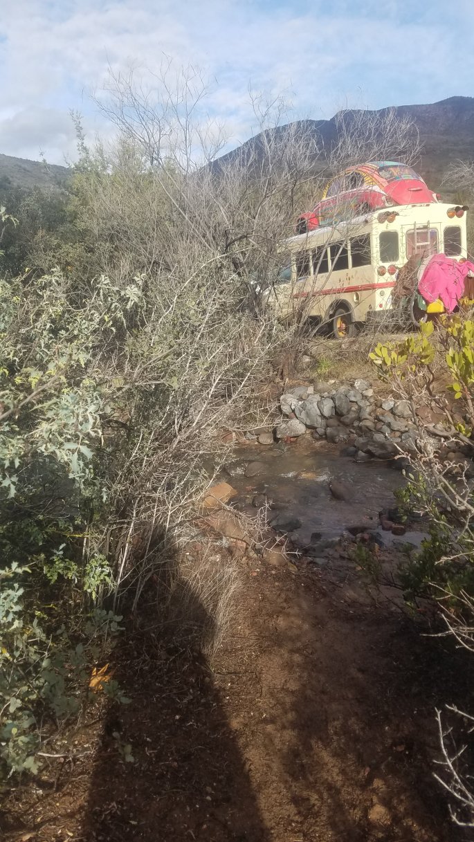 I dont even know where to start. I should’ve written yesterday but it was a long busy day. I guess it be best to start with the flood warning we all received almost simultaneously and the kid with eleven little dogs who parked in the wash that turned into running stream. I should mention that stream had a mercury mine leaking into it and rose to be 4 feet on the trailer. After a long day of rain and inaction on the guys part, he was really starting to hustle trying to rescue his trailer and dogs. After the dogs were across and his trailer anchored more properly he went to put out the fire in the woodstove. I didn’t witness a flash flood but by the morning my bus was parked creek side.
