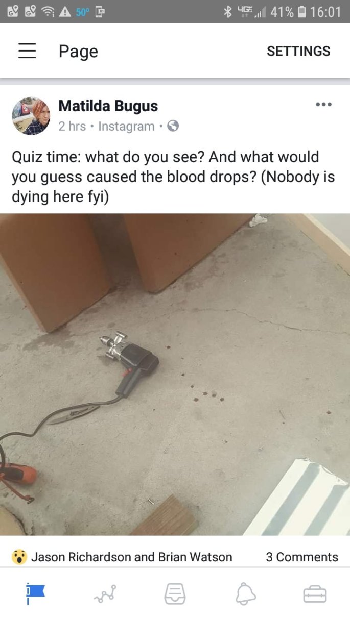 the solution to the Quiz: 2 drills, the knife, the sheet metal, the door, drops of blood. The drill caused the cut. out of all those sharp options, the dullest, and most painful, was the culprit.