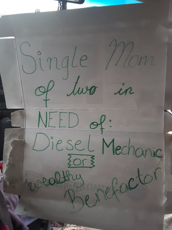There’s this lady flying a sign on the corner right opposite me. She’s been there for hours. Her name is Carol. She lives here, but apparently has been through living in a truck with two kids in “her younger years” as she puts it. She gave me a little money wishing she could help more. I’m very grateful she wants to help at all. She feels like a kindred spirit. As she stands on the corner with her sign she’s communicating with the world around her and being helpful instead of just a block on the side of the road staring pitifully into the dark hole of misery. I hope she’s happy, she seems like it. I hope she makes the money she needs and beyond.
