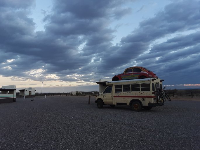 Giggles took a ride with us. He needed to go to the post office and up to Santa Fe so I would at least give him a ride to T or C. We stopped at a Rest area for the night. I took the chance in the morning to clean up the bus from the last few days of nonsense.