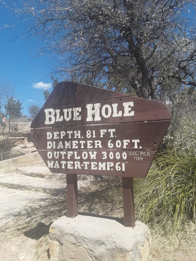 Our next stop was the Blue Hole. A natural spring, 60 ft in diameter but 81ft deep. A very beautiful Azur color. We watched people in groups go into it in Wet suits to practice their scuba diving. I would love to jump into it to go swimming, considering the water temp is 60* it’s not that much cooler than outside temps, but they ask that everybody be capable of swimming on their own and no floaties allowed, so my kids are still excluded. Better for my head to stay out, I bet.