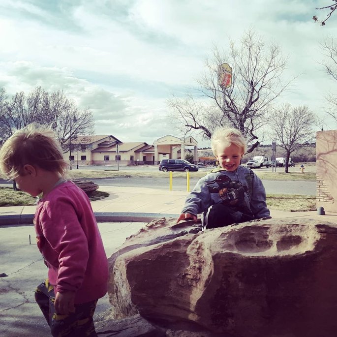 We left our campsite shortly after noon. It’s a great time for driving as the kids are likely to sleep. It’s exactly what happened on our stretch. The road out of the woods was very bumpy but not very long and soon we cruised along Route 66 through Edgewood and Moriarty. I was listening to Shakey Graves’ “Built to Roam” and it put me in a wonderful zen mode to drive all the way to Santa Rosa where we pulled straight into the Park in the center of town. I really needed a rest. The boys played at the Park with Daniel until I felt somewhat competent to go out and play along.