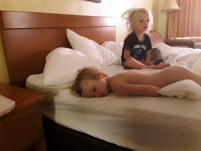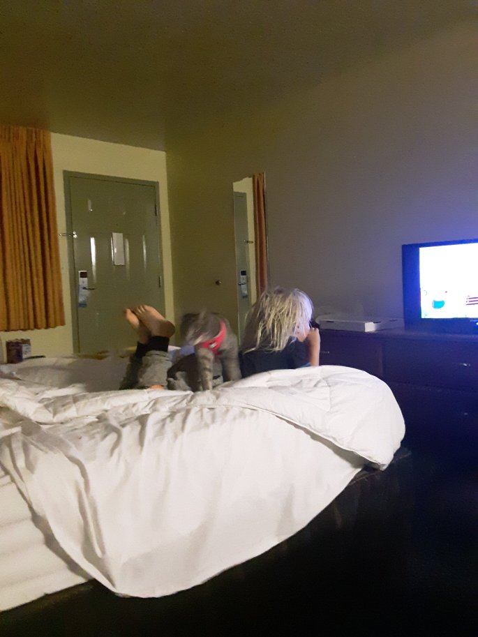 Then, I scrolled my newsfeed and realized that I have like NO real friends that I speak to on a regular. I poop in my boot on that too much. Just when I had those thoughts, my paypal dinged. Crikett sent me a donation. She said it was for me because she’s happy that I’m doing something good for myself. How very kind and thoughtful of her! I do feel a little bad that my lifestyle choice is costing people around me their hard earned cash, but I’m not twisting anybody’s arm either. I got to do some adult chatting and felt a lot better. Especially than I had that morning.The night itself was restless. We played bed-roulette. I awoke with Atreyu crawling into my bed. Then, I woke with a start because Galixy almost fell off his bed. I can’t even explain what startled me, he didn’t fall but he was so close. I cuddled Atreyu up and went into Galixy’s bed. Before the sun came up, we were all in the same bed. I had unplugged the fridge in hopes that it not running all night would allow me to sleep in. Not so. 6:45 AM and we were up. I did wake up before the boys, I should’ve just turned over and gone back to sleep. I just really enjoy Hotel breakfast, so I got up.