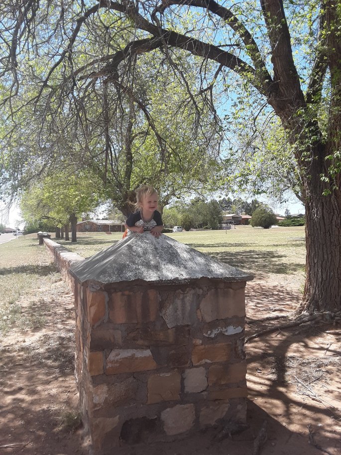 The hotel breakfast wasn’t bad. Tons of options, but missing fruit. After eating I tossed the boys into the tub another time. I offered going swimming, but Atreyu said he preffered to watch TV. I feel like if I tell him “no” all the time to his “favorite thing to do” He’ll not only resent me, but end up watching TV throughout his adult life. Or, if apocalypse fantasies come true, he’ll be so mad that he missed out on it all. So I’ve decided to not feel so bad about the hotel binge.We checked out of the hotel at about 10. The front desk lady was super friendly. She really liked our bus. I’m glad it made her smile. We drove to Tucumcari. Galixy fell asleep on the way. I pulled up right to a playground. Atreyu was eager to get out and play.