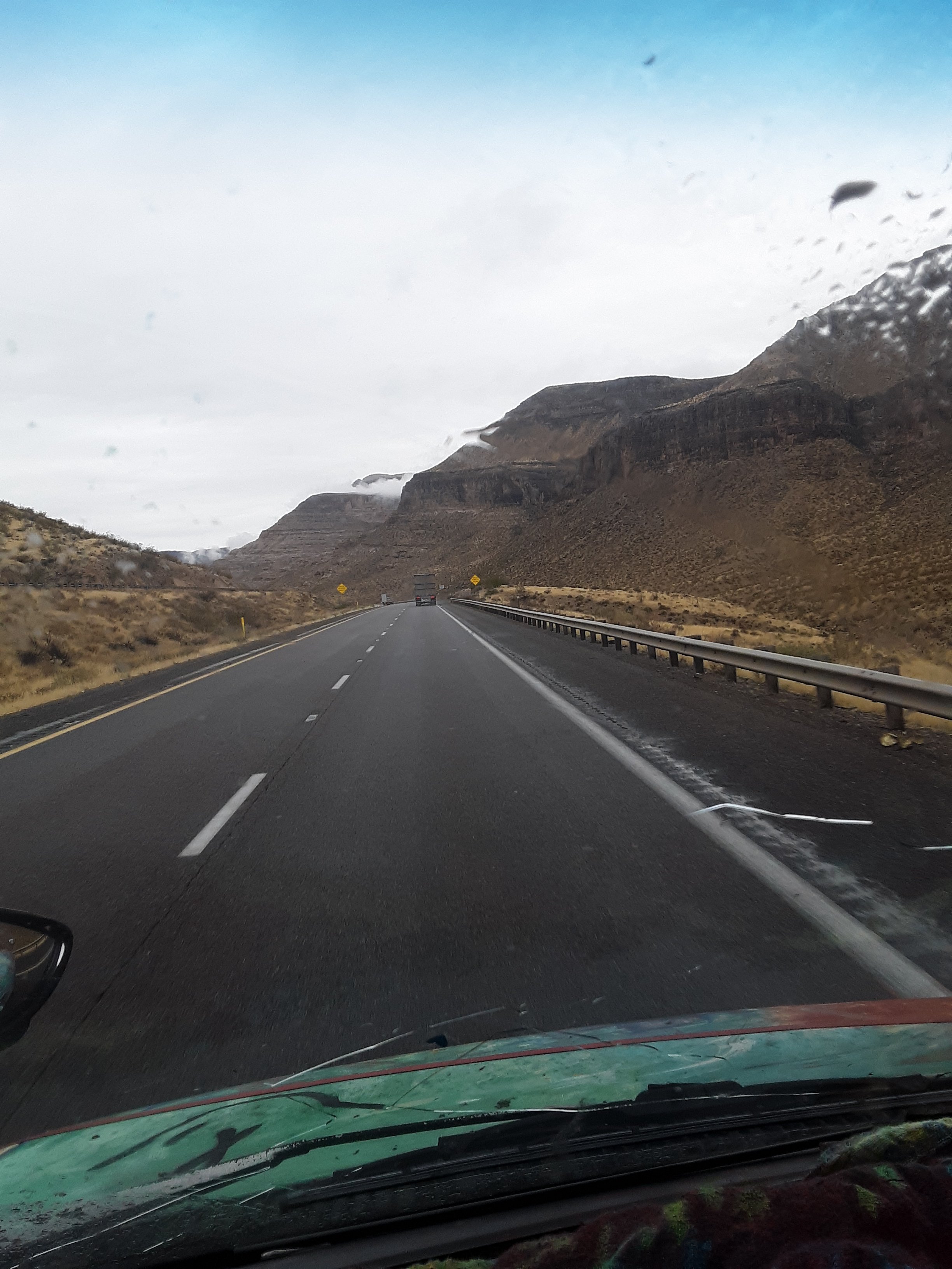 Oh yeah! It rained heavy last night and my bed got a corner wet, so I wasn’t too sad to get up, especially since it wasn’t exactly cold out either. Atreyu was the first to wake up. Galixy took a little while. I spent the morning cleaning and organizing which didn’t take very long. Then we headed down the road. I didn’t really have much of a plan in mind besides maybe better wetter. We made it out of Utah and through that Arizona corner in one stretch. Right as we got up to the Loves 20 miles outside Las Vegas, Galixy said he wanted a break. I could only agree. Stormy weather just cleared in time for the break.