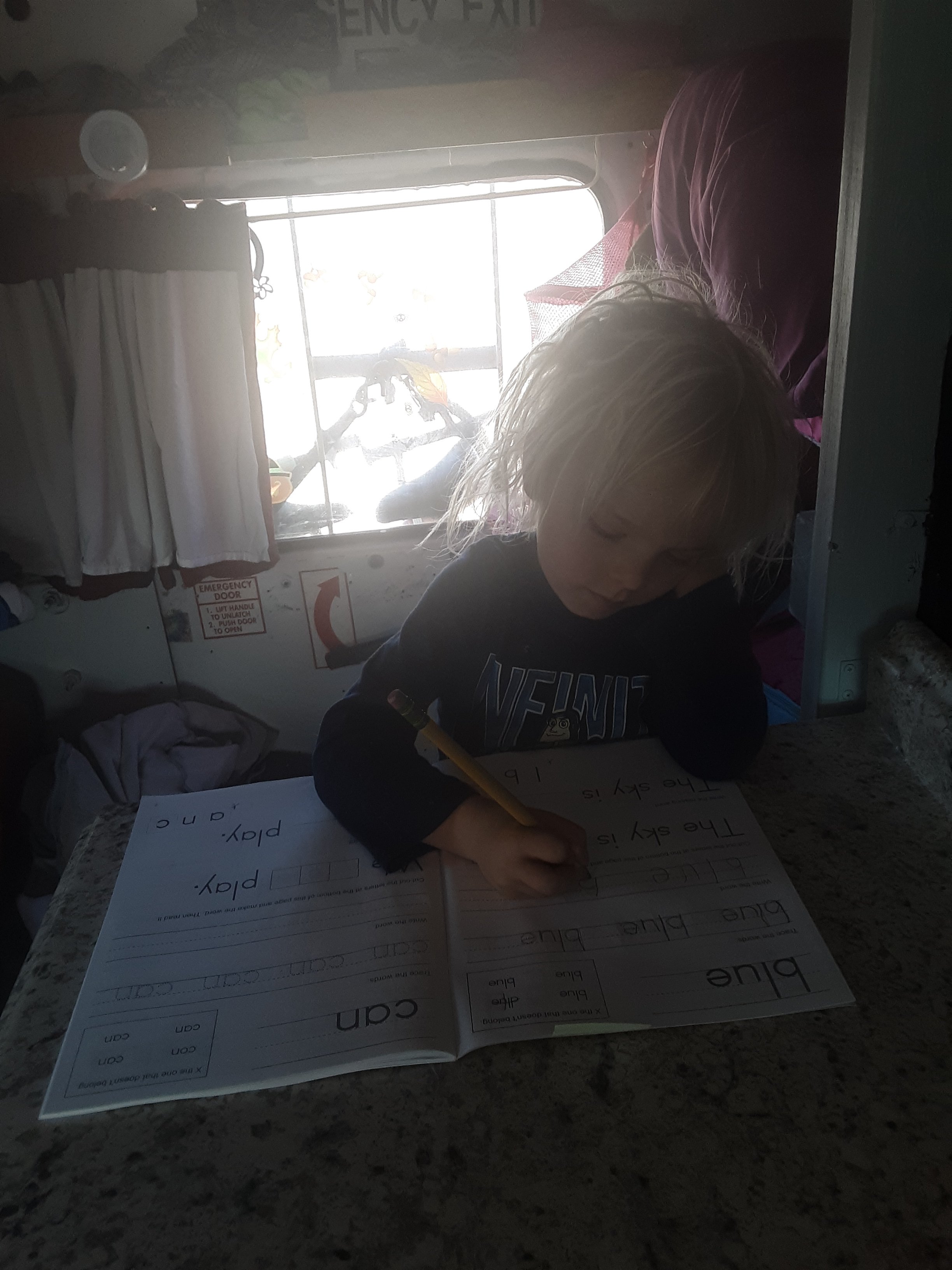 As predicted the morning was absolutely gloriously sunny. It was a wonderful wake up with oatmeal for the kids and lots of delicious coffee for me. We woke up super early and it didn’t take long for Atreyu to start telling me we should start heading towards the swimming pool. I held them off with school work! AH! I do have a picture for today! look at my hard working boy!