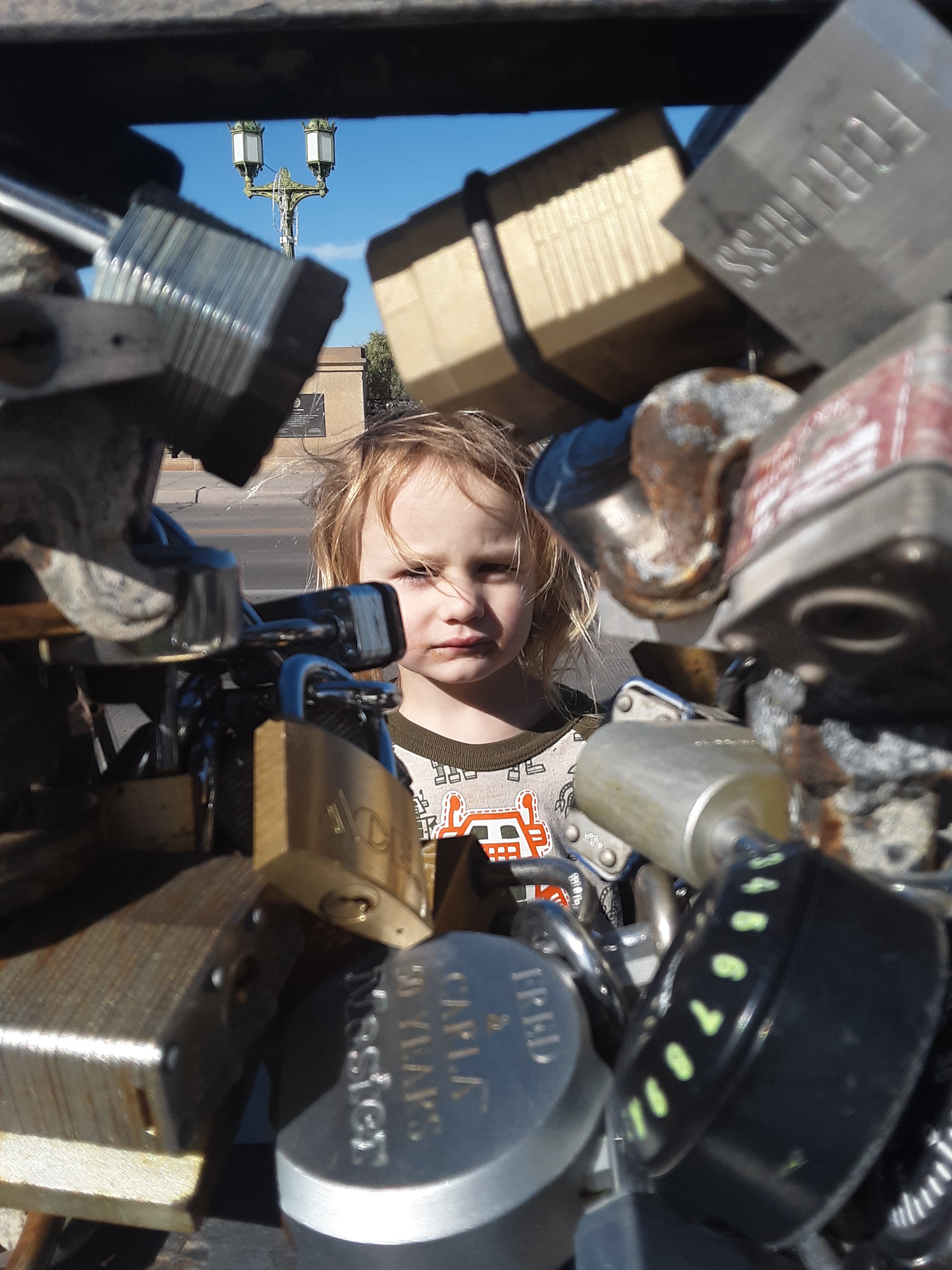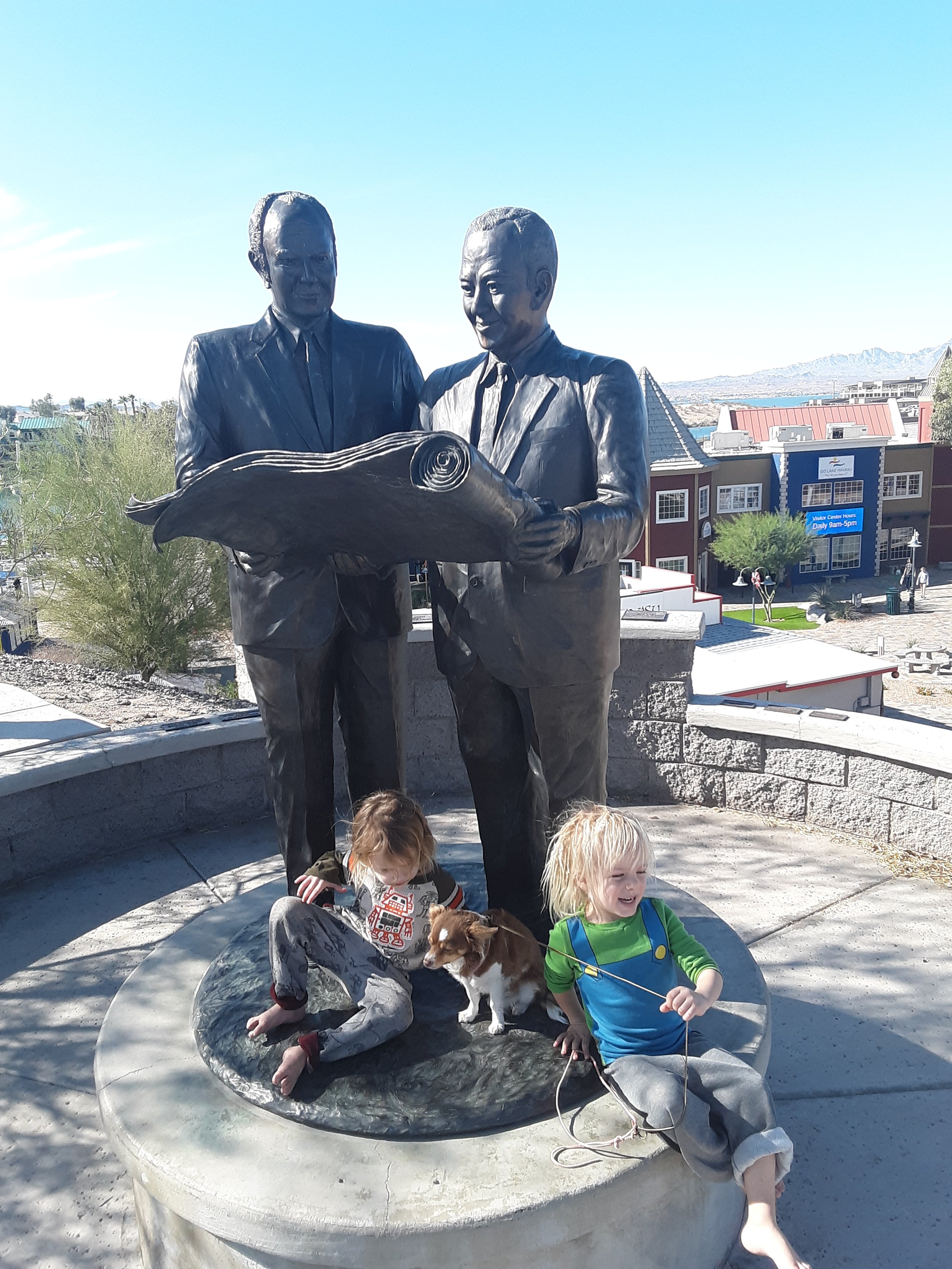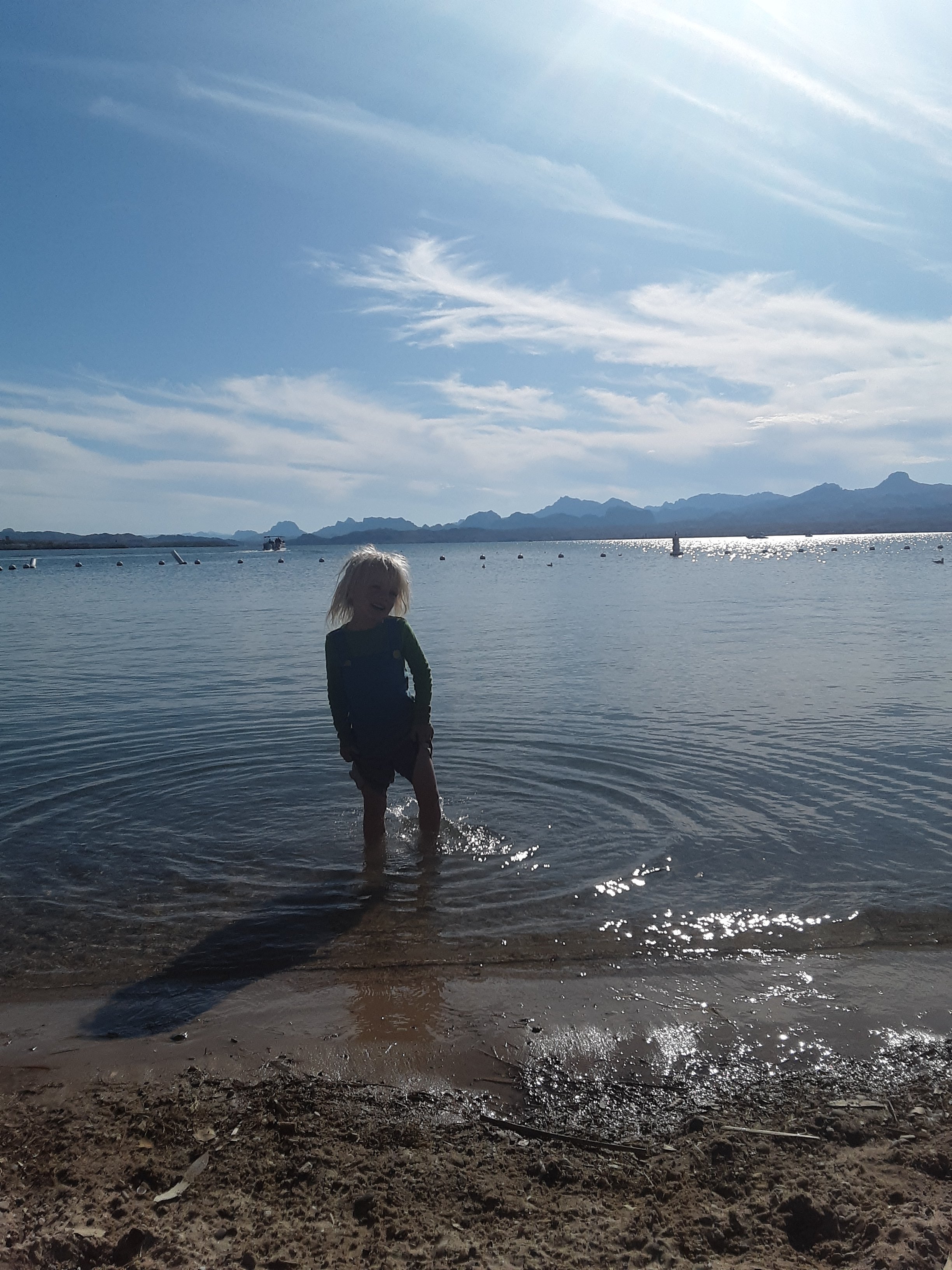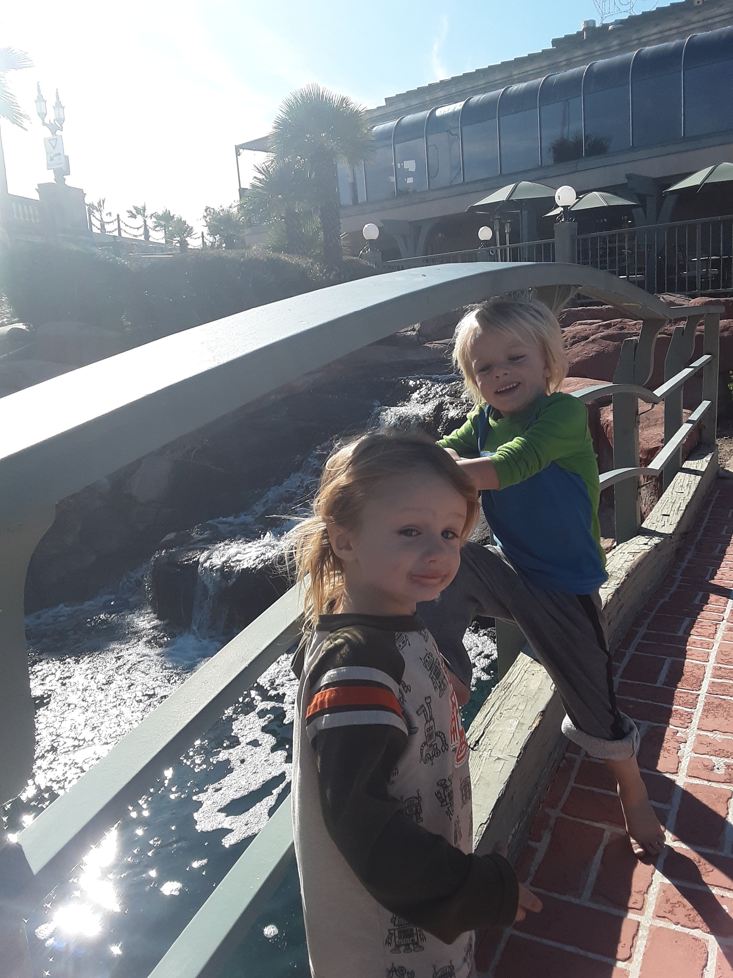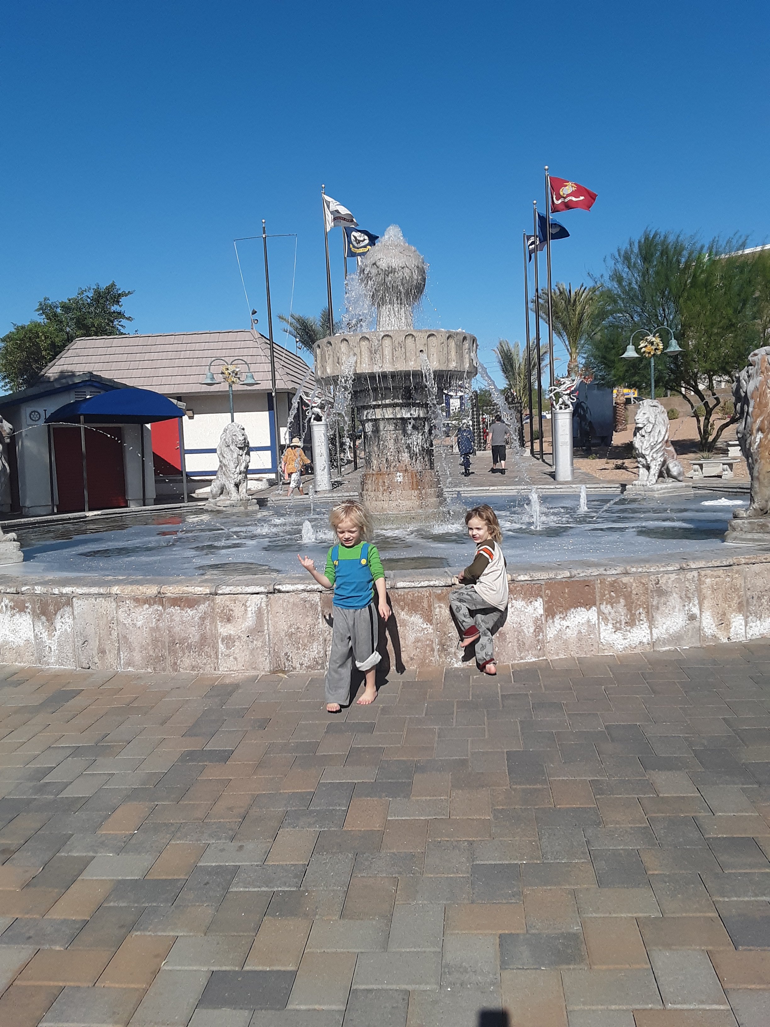 It was infact a good choice. The weather was so nice and balmy and the kids felt so free and happy to be by the water. They fed ducks hemp seeds and corn chips, threw mud at a tree, built mud towers, waded in the water, rode strider bikes all around, explored two playgrounds, went on two rather long walks over the london bridge replica, and ate fish and chips upon Atreyu’s adament request! Pictures really say more so have some of those!