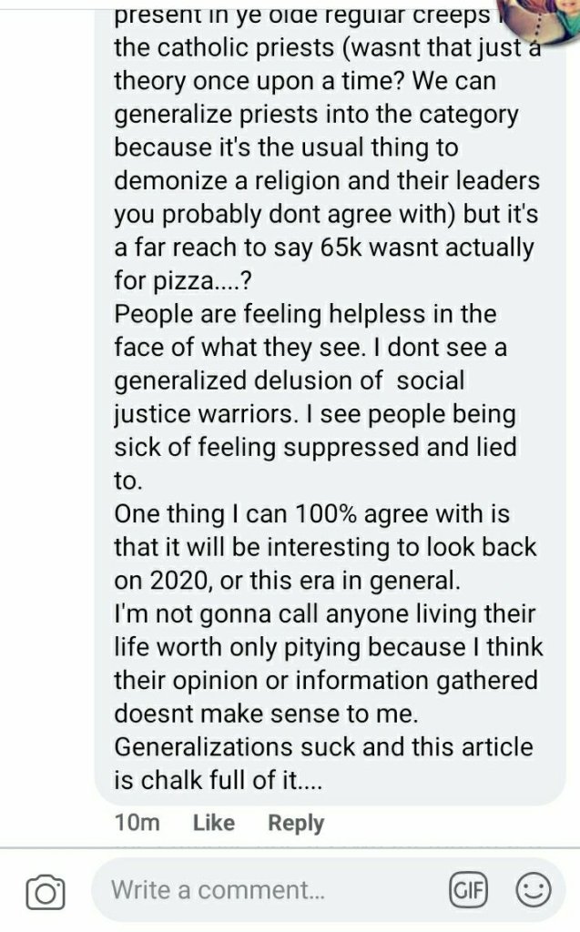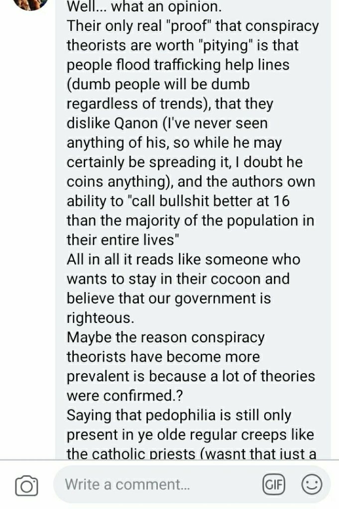 In reality I’m fighting tooth and nail against fleas and ‘semi’ quarantine (I’m honestly not harshly avoiding contact with people, but wearing a mask in public places and staying at my mom’s instead of traveling. No matter what I believe about the severity of whatever, it doesn’t cost me anything to be mindful and use this weird time in some efficient way, even if that means sometimes just resting cause I can’t really afford to do anything anyway…..) soooo with the intent fight against fleas in reality and a wonderful spectacle of human interaction online cummulating information bias and openly looking into the few glimpses algorithms give me to opposing views, I’ve taken the time to *gasp* think a lot. I figured this would be a good place to put my little thought meanderings. A distraction of a probably unbiased source about a lot current things. From coming across this article about how #SaveOurChildren is a fake conspiracy theory on my feed this morning surmising in the following pictured comments, to my immediate future, they may tell us to stop moving about physically, but I believe it stores up energy or you begin to move mentally. Over-thinking, can be a problem……