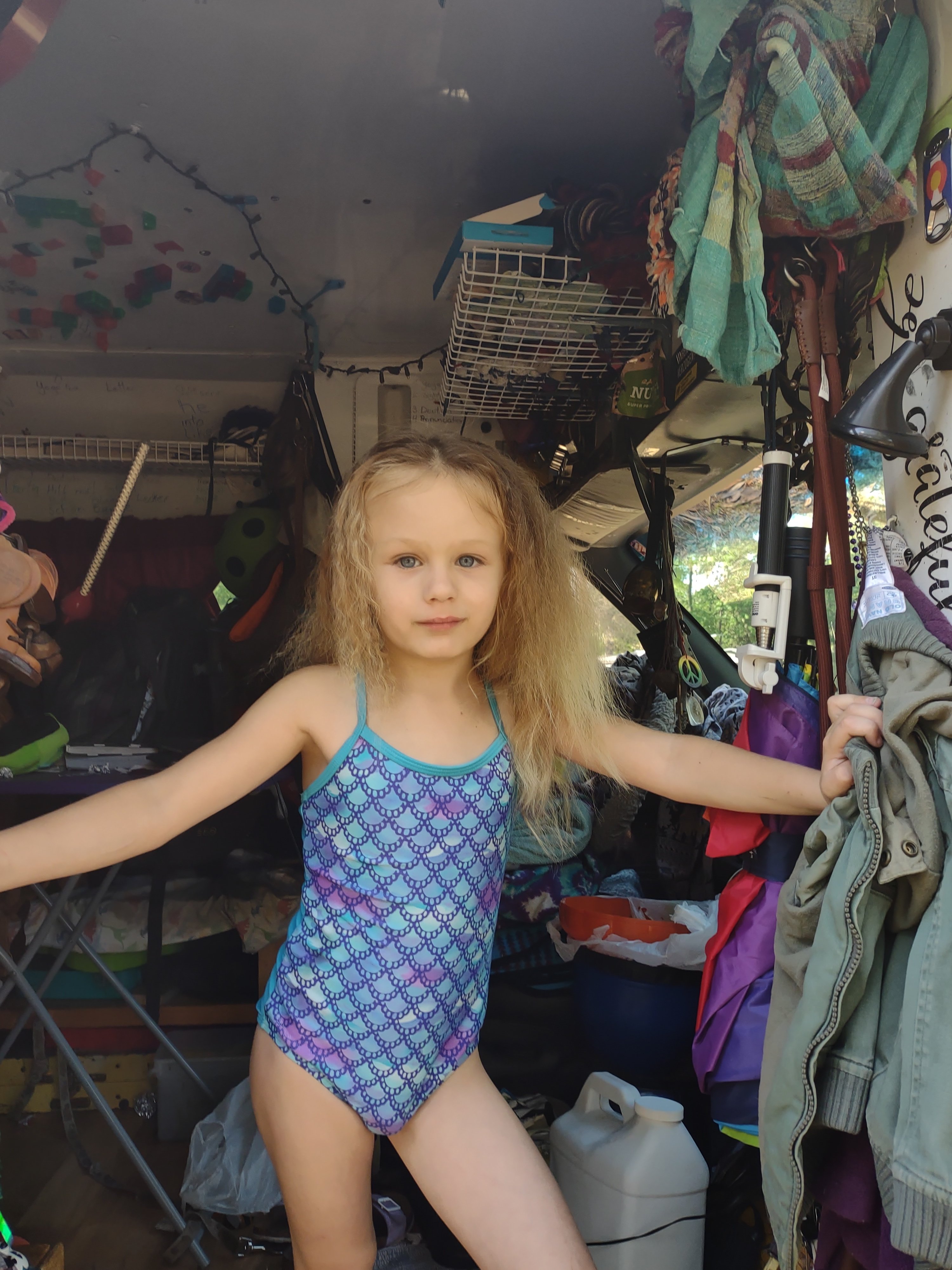 I failed to set a timer, so here I am on the next day. The kids had a great day yesterday. The river here is great for the kid to go splash, so in the next hour or so we’ll be driving the bus the half mile to spend some more time right next to the river. The bus is clean and the kids are practicing balancing on their strider bikes.Galixy already did her workbook letter for today. A good start.