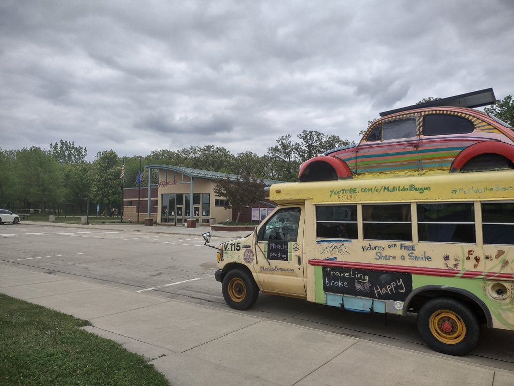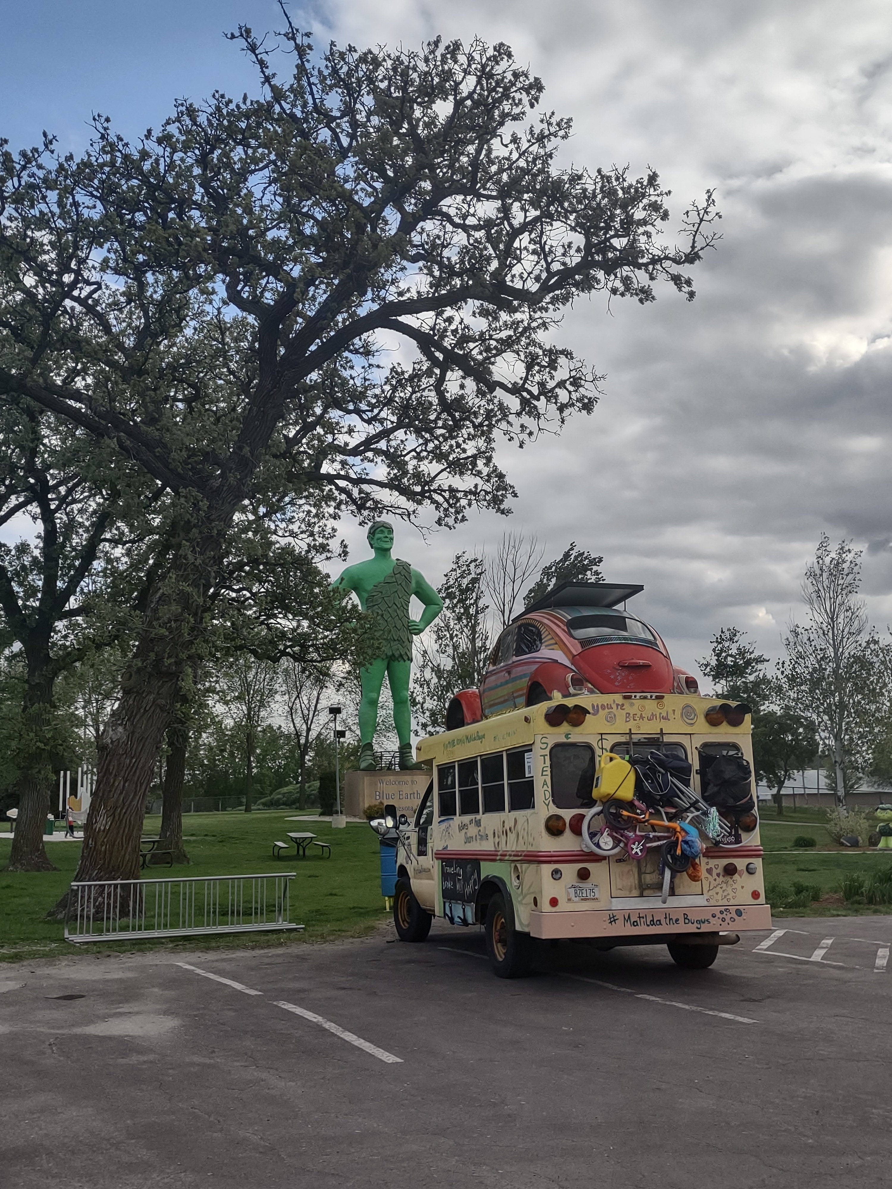 Coffee is hot and the kids are still sleeping, which is really surprising considering that I was woken by Gizzi barking. He actually alerted twice. The first time looking out I didn’t see anything or anyone but when he barked again I looked closer and there was a blonde lady standing outside of the bus. She must’ve done something to bother Gizzi cause all the curtains were closed and he sleeps pretty tightly. This town or truck stop is weird. This guy just took a whiz on the grass field during which he decided to look mostly at bugus (he was far enough away that the only reason I’m assuming he was peeing was through body structure. He then skipped over within a 100 yards, took a pic and then ran back to his yoga mat where he’s now doing stretches. Just to point out, I see weird as a compliment because it means you’re focused enough on living your humanity that you don’t care about how others perceive it or you. Now the mat is rolled up and he is loading it into a silver car that was parked at a pump through the duration of his exercise. Leaving a car at the pump instead of driving it to the spot of your stretches. There must be little going on out here. Oh there’s more people in the car…..