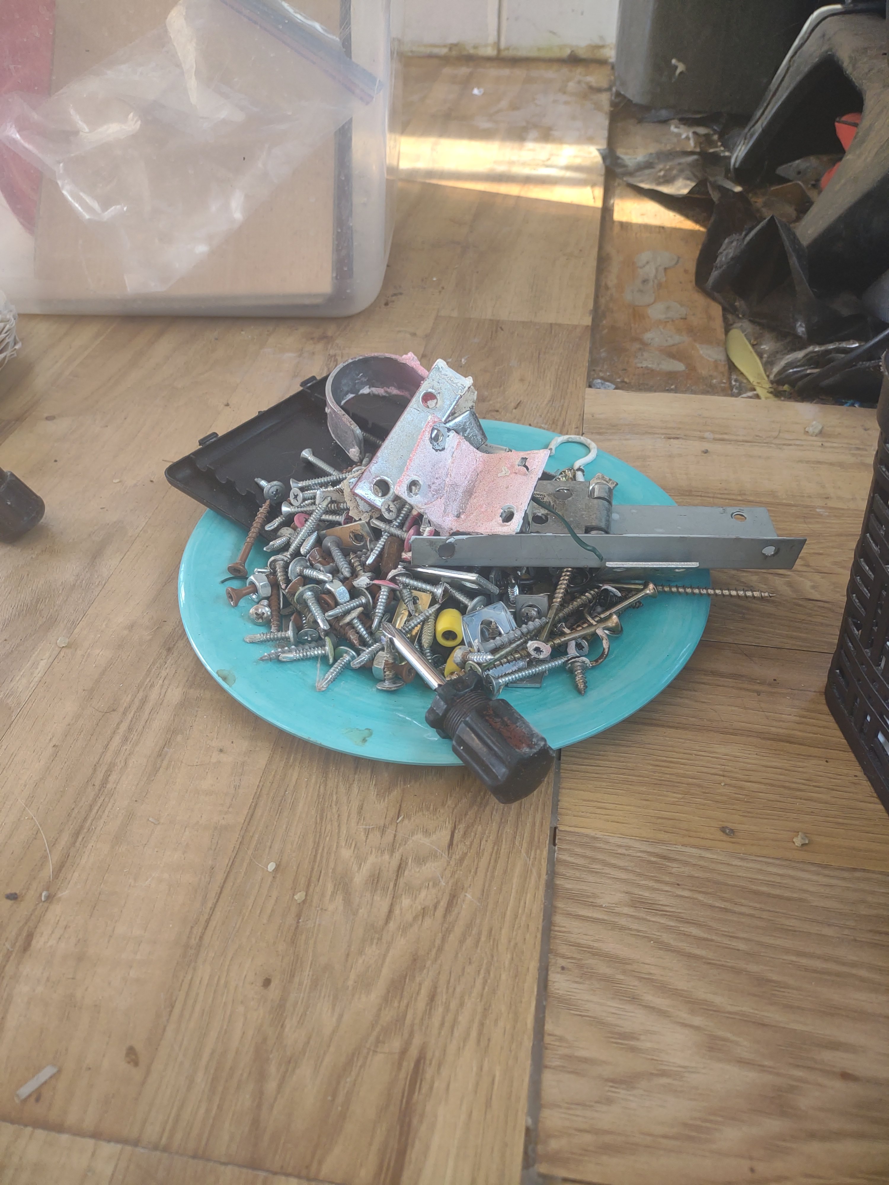I had a motivation hit me yesterday. I knew that if I started pulling stuff in the morning time, I’d get some stuff done, more so than if I wait until afternoon. And as I expected once all the things I deemed safe were out and I started getting on the hard parts to pull, I got grossed out by the bug presence (apparently heating it didn’t work so well and they’re insecticide proof?) So I started a fire to burn them beasts and as all the screws and things were plastered shut from last years latex painting, I got the sledgehammer and went to town on it. I really did a good job sealing them bitches in last year. Now they’re all burny. I mean, maybe not all….