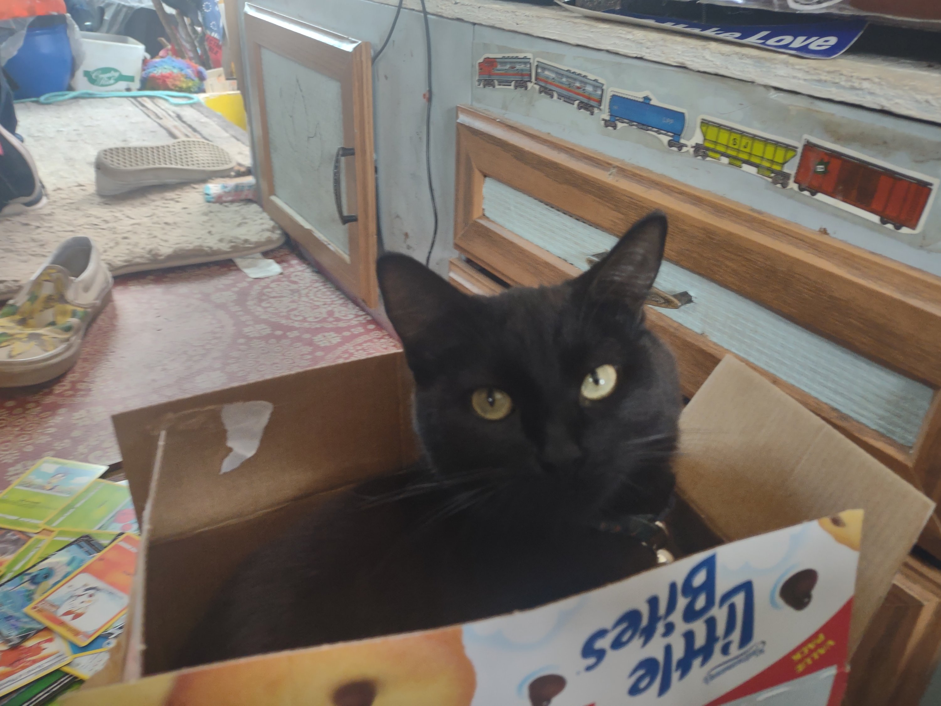 Now that the sun has a solid position sans clouds, the wind is way less bothersome and I kicked the kids out to go play. Gizzi stays on his leash while Rhea gets a bit of minor roaming time. The cat has also caught on that we don’t go too far from the bus. By “we” I mean her. She chills with me then goes to attack a swirling leaf blown into her sight by the wind. It pisses Gizmo off cause it’s flaunting his lack of freedom infront of his nose. But he still runs off too far and goes to roll in crap, which Rhea does too, but he’s more consistent about it every time he gets off leash. He does bark less at people when he’s free though.