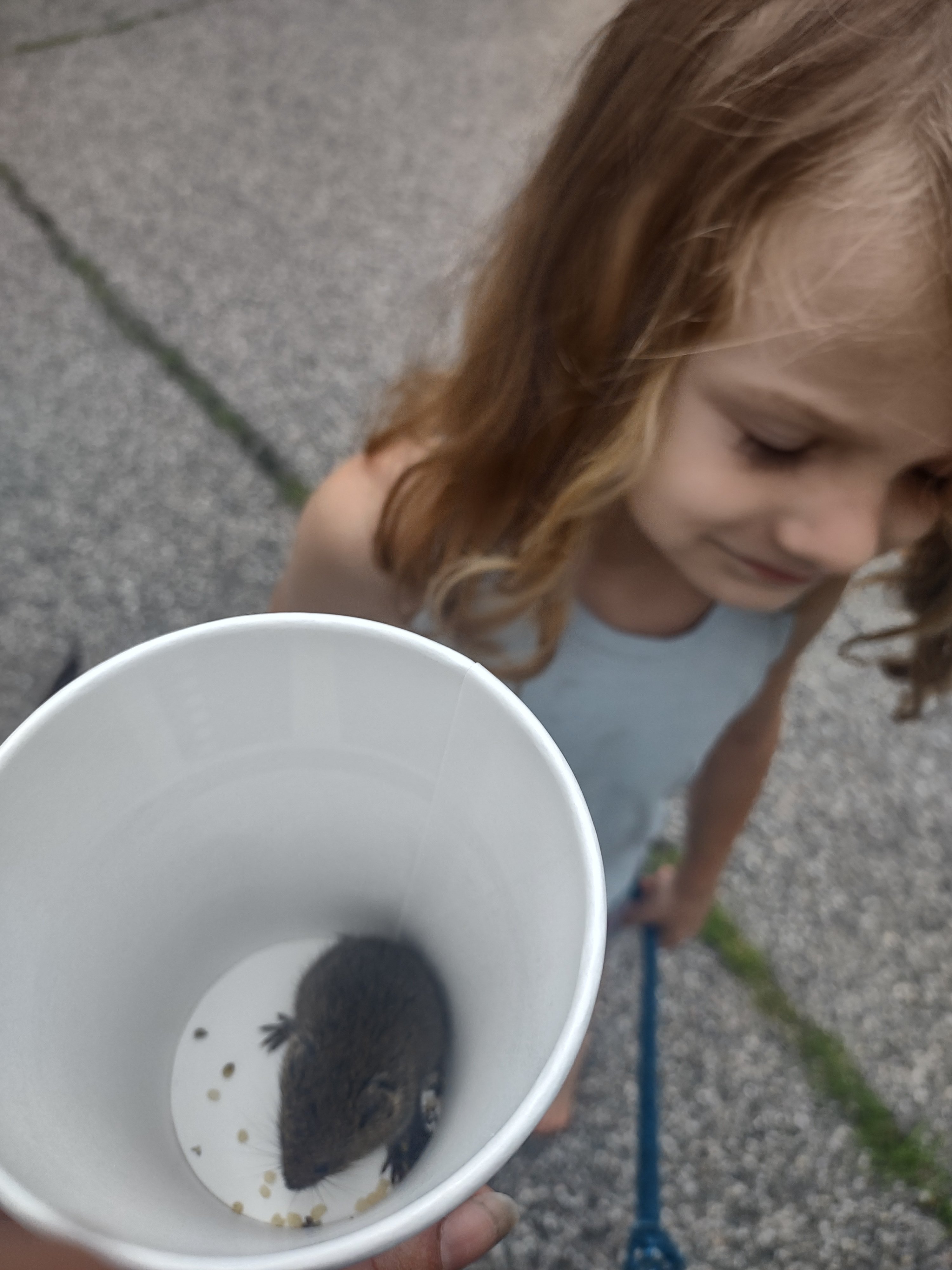 Yesterday we went to a wonderful playground where the kids rode the scooter around the basketball court. Mauve kept finding mouse after mouse. we separated her from a few and saved their little lives, but at the very end, the monstrous Me-auve brought one in the bus. And let it escape. I put out our live mousetrap with a piece of Pizza crust in it, but we found the mouse dead inside of it this morning. Suspicious circumstances.